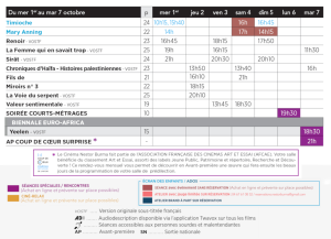 Image programme-sept-oct 2025.pdf (pdf / 1.54 Mo) <<Du 01 octobreau 07 octobre>> Grille programme du 1 au 07 octobre 01/10/2025 au 07/10/2025 Lire la suite LA VOIE DU SERPENT 02/10/2025 au 14/10/2025 Lire la suite VALEUR SENTIMENTALE 03/10/2025 au 04/10/2025 Lire la suite LA FEMME QUI EN SAVAIT TROP 03/10/2025 au 07/10/2025 Lire la suite RENOIR 03/10/2025 au 10/10/2025 Lire la suite SIRÂT 03/10/2025 au 12/10/2025 Lire la suite CHRONIQUES D'HAÏFA, HISTOIRES PALESTINIENNES 04/10/2025 au 07/10/2025 Lire la suite TIMIOCHE 04/10/2025 au 23/10/2025 Lire la suite MARY ANNING 04/10/2025 au 21/10/2025 Lire la suite FILS DE Le 04/10/2025 Lire la suite SOIRÉE SPÉCIALE COURTS MÉTRAGES 06/10/2025 au 06/10/2025 Lire la suite BIENNALE EURO-AFRICA / YEELEN Le 07/10/2025 Lire la suite AVANT-PREMIÈRE COUP DE COEUR SURPRISE AFCAE 07/10/2025 au 03/12/2025 Lire la suite