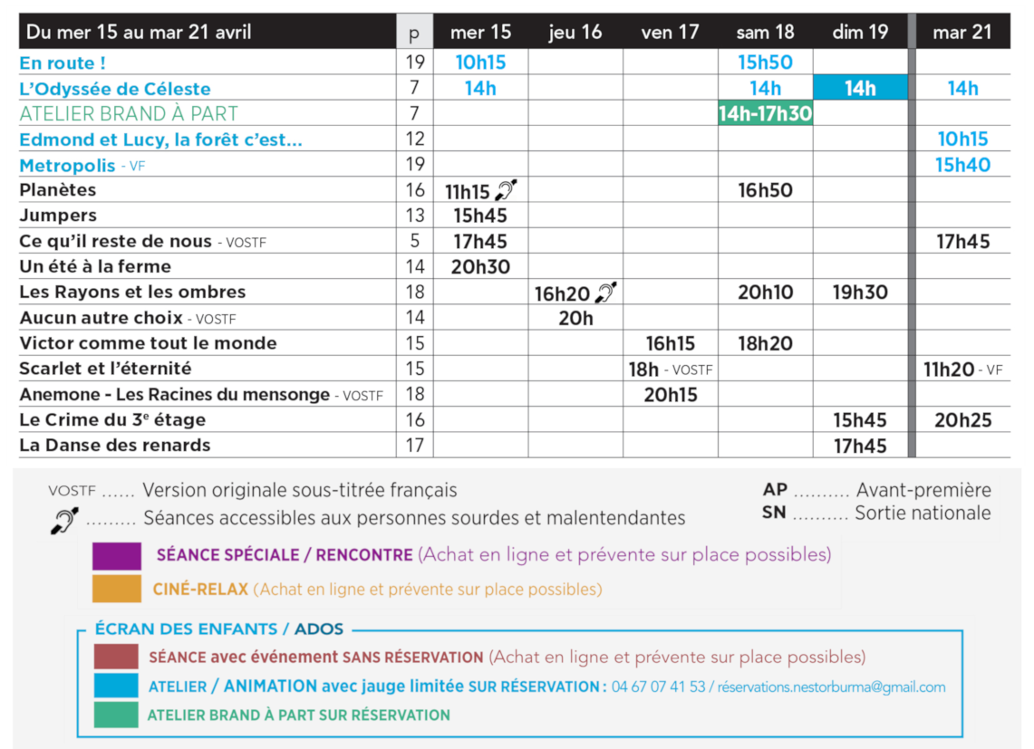 Image Programme du 8 avril au 12 mai 2026.pdf (pdf / 1.99 Mo) <<Du 15 avrilau 21 avril>> Grille programme du mer 15 au mar 21 avril 15/04/2026 au 21/04/2026 Plus d'infos VICTOR COMME TOUT LE MONDE 17/04/2026 au 18/04/2026 Plus d'infos SCARLET ET L'ÉTERNITÉ 17/04/2026 au 21/04/2026 Plus d'infos ANEMONE - LES RACINES DU MENSONGE 17/04/2026 au 26/04/2026 Plus d'infos L'ODYSSÉE DE CÉLESTE 18/04/2026 au 24/04/2026 Plus d'infos ATELIERS D’INITIATION AU CINÉMA - BRAND à PART / EXPLORE L’ESPACE 18/04/2026 au 18/04/2026 Plus d'infos EN ROUTE 18/04/2026 au 26/04/2026 Plus d'infos PLANETES 18/04/2026 au 28/04/2026 Plus d'infos LES RAYONS ET LES OMBRES 18/04/2026 au 24/04/2026 Plus d'infos LE CRIME DU 3E ETAGE 19/04/2026 au 21/04/2026 Plus d'infos LA DANSE DES RENARDS Le 19/04/2026 Plus d'infos EDMOND et LUCY la forêt c'est l'aventure Le 21/04/2026 Plus d'infos METROPOLIS Le 21/04/2026 Plus d'infos CE QU'IL RESTE DE NOUS 21/04/2026 au 10/05/2026 Plus d'infos