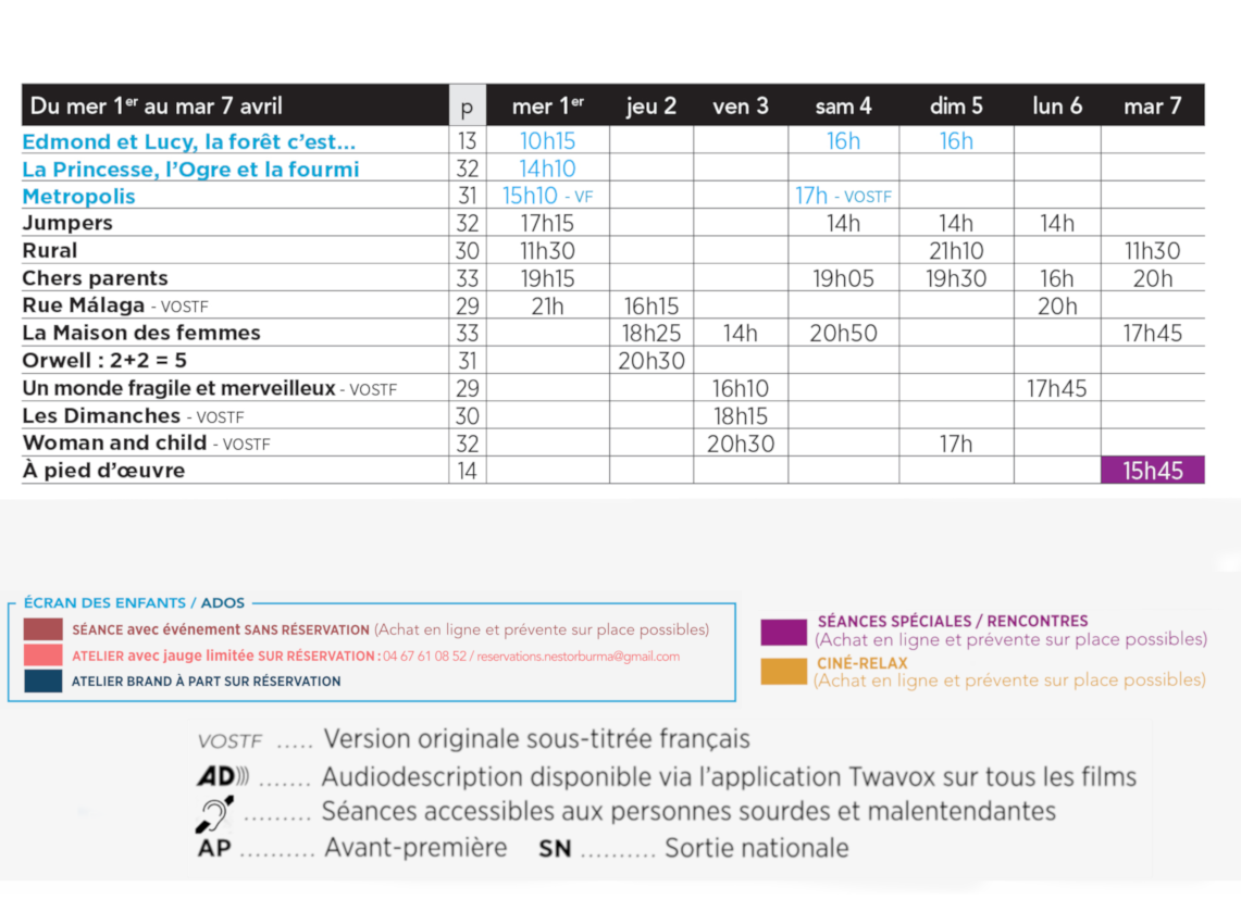 Image programme CINEMA du 25 février au 7 avril 2026.pdf (pdf / 1.54 Mo) <<Du 01 avrilau 07 avril>> Programme du 1 au 07 avril 01/04/2026 au 07/04/2026 Plus d'infos RUE MALAGA 01/04/2026 au 06/04/2026 Plus d'infos LA MAISON DES FEMMES 02/04/2026 au 14/04/2026 Plus d'infos ORWELL : 2+2=5 Le 02/04/2026 Plus d'infos UN MONDE FRAGILE ET MERVEILLEUX 03/04/2026 au 06/04/2026 Plus d'infos LES DIMANCHES Le 03/04/2026 Plus d'infos WOMAN AND CHILD 03/04/2026 au 09/04/2026 Plus d'infos JUMPERS 04/04/2026 au 15/04/2026 Plus d'infos EDMOND et LUCY la forêt c'est l'aventure 04/04/2026 au 21/04/2026 Plus d'infos METROPOLIS 04/04/2026 au 21/04/2026 Plus d'infos CHERS PARENTS 04/04/2026 au 07/04/2026 Plus d'infos RURAL 05/04/2026 au 07/04/2026 Plus d'infos À PIED D'ŒUVRE Le 07/04/2026 Plus d'infos