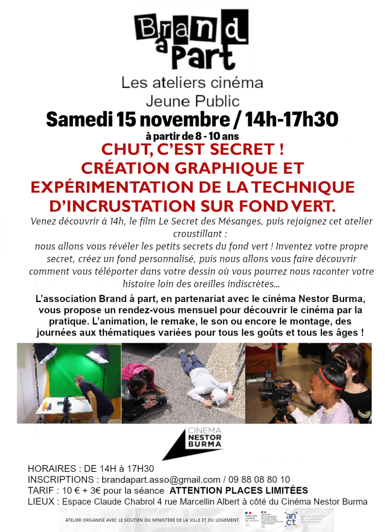 L’association Brand à part, en partenariat avec le cinéma Nestor Burma, vous propose un rendez-vous mensuel pour découvrir le cinéma par la pratique. L’animation, le remake, le son ou encore le montage, des journées aux thématiques variées pour tous les goûts et tous les âges