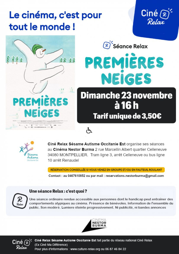 Le dispositif Ciné Relax rend la culture accessible en inclusion à des personnes qui en sont privées par leur handicap. Parce que le cinéma doit être ouvert à toutes et tous, le cinéma Nestor Burma, en partenariat avec Sésame Autisme Occitanie-Est, propose une fois par mois ces séances chaleureuses et bienveillantes destinées à tout le monde, avec ou sans handicap, pour un beau moment de partage.
